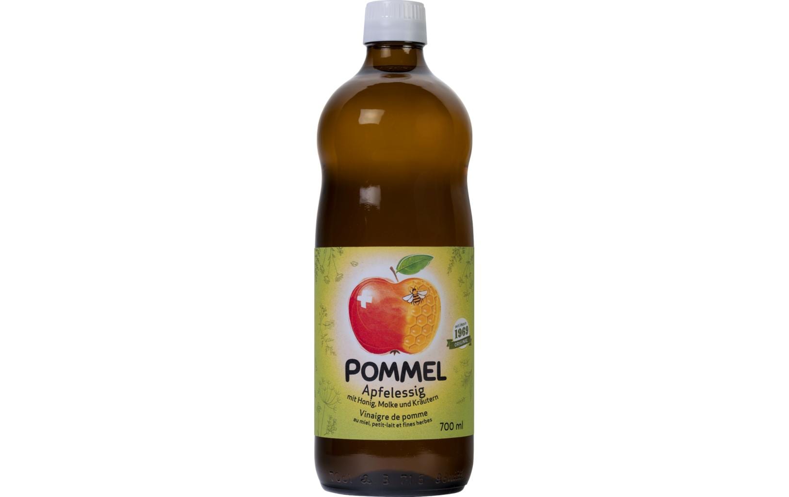 Pommel Apfelessig mit Honig, Molke und Kräutern 0.7 l Produkttyp: Apfelessig, Ernährungsweise: Vegetarisch, Produktionsland: Schweiz, Nachhaltigkeit: Keine Zertifizierung, Anzahl Stück: 1 Stück, Fairtrade: Nein