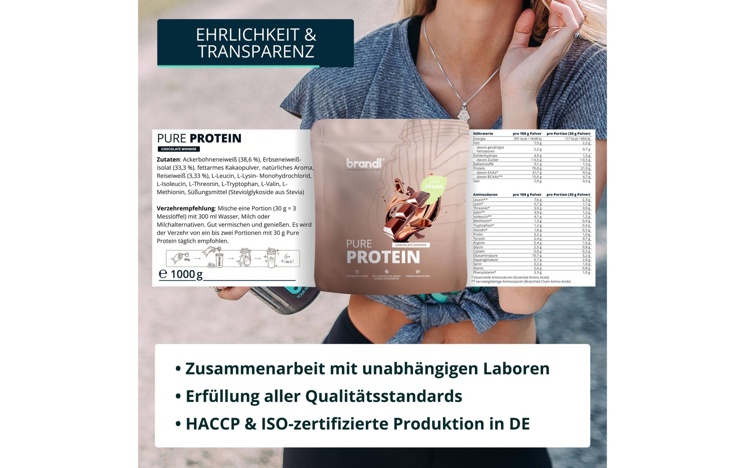Brandl-Nutrition Pulver Pure Protein 2.0 Vegan Schokolade 1000 g Produktionsland: Deutschland, Anwendungszweck: Muskelaufbau, Einnahme: Nach Aktivität, Nachhaltigkeit: Keine Zertifizierung, Gewicht pro Einheit: 1000 g, Verpackungseinheit: 1 Stück