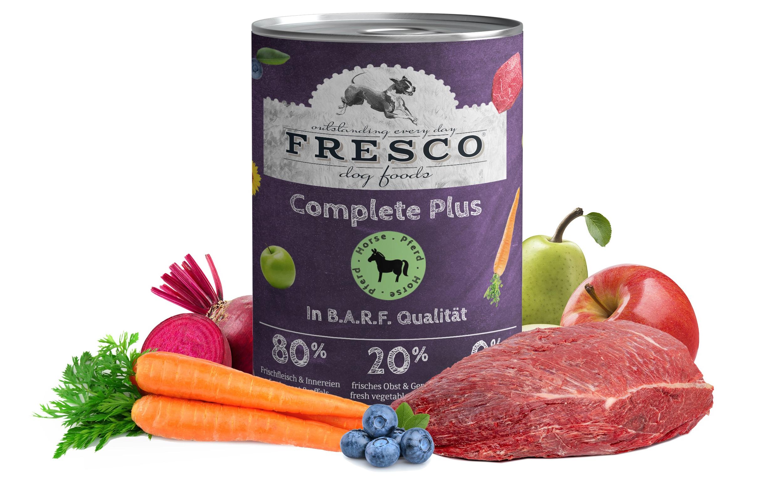 FRESCO Nassfutter Complete Plus Pferd 400 g Tierbedürfnis: Kein besonderes Bedürfnis, Nachhaltigkeit: Nicht angegeben, Lebensphase: Adult, Junghunde, Senior, Tierart: Hund, Fleischsorte: Pferd, Futtereigenschaft: Getreidefrei, Glutenfrei, Hoher Fleischanteil, Ohne künstliche Zusätze, Ohne Zuckerzusatz, Single Protein