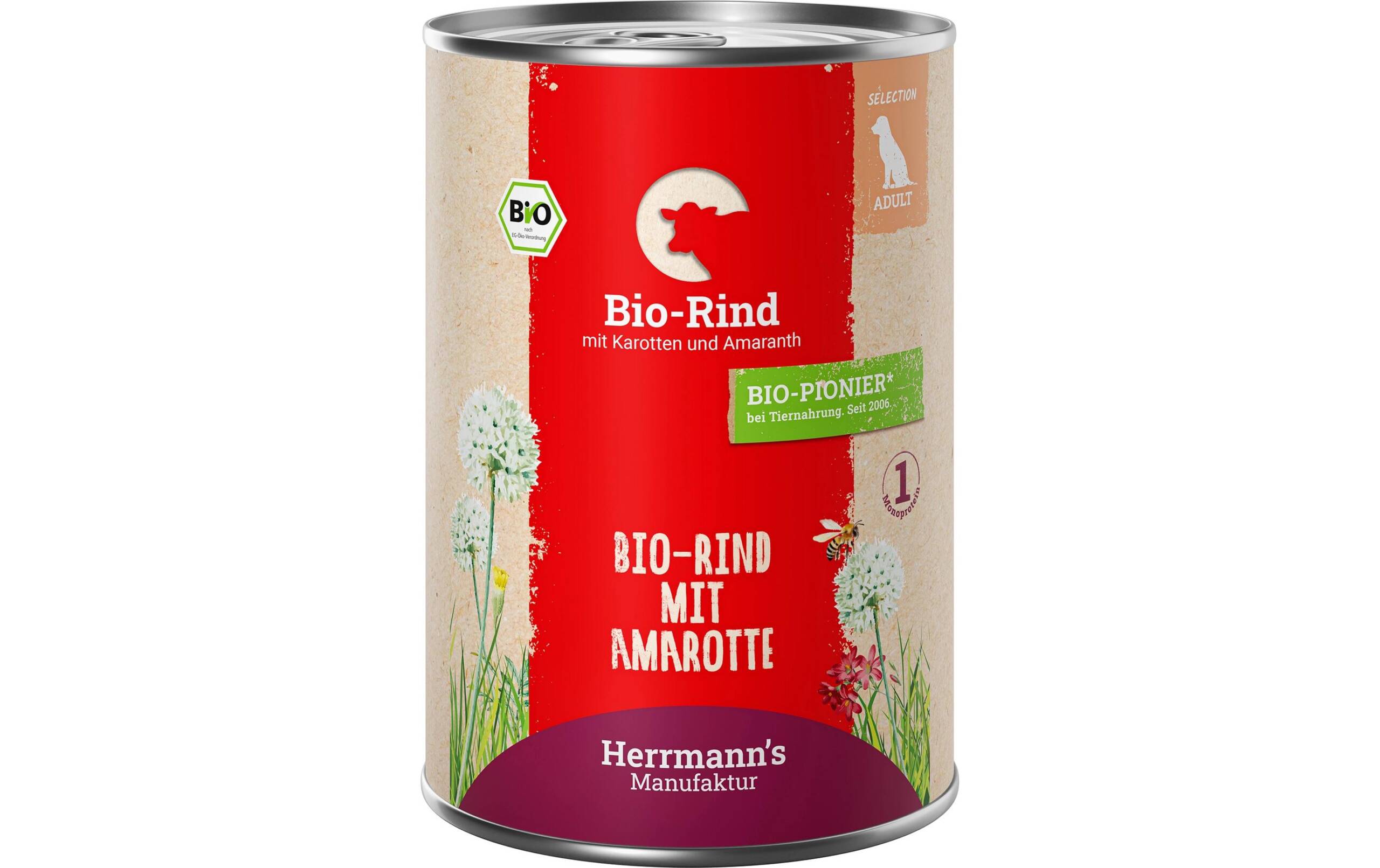 Herrmann’s Nassfutter Bio Rind mit Karotten und Amaranth 400 g Tierbedürfnis: Kein besonderes Bedürfnis, Zertifikate: EU BIO, Fleischsorte: Rind, Futtereigenschaft: Bio, Getreidefrei, Glutenfrei, Ohne künstliche Zusätze, Ohne Zuckerzusatz, Single Protein, Produkttyp: Alleinfutter, Packungsgrösse: 400 g