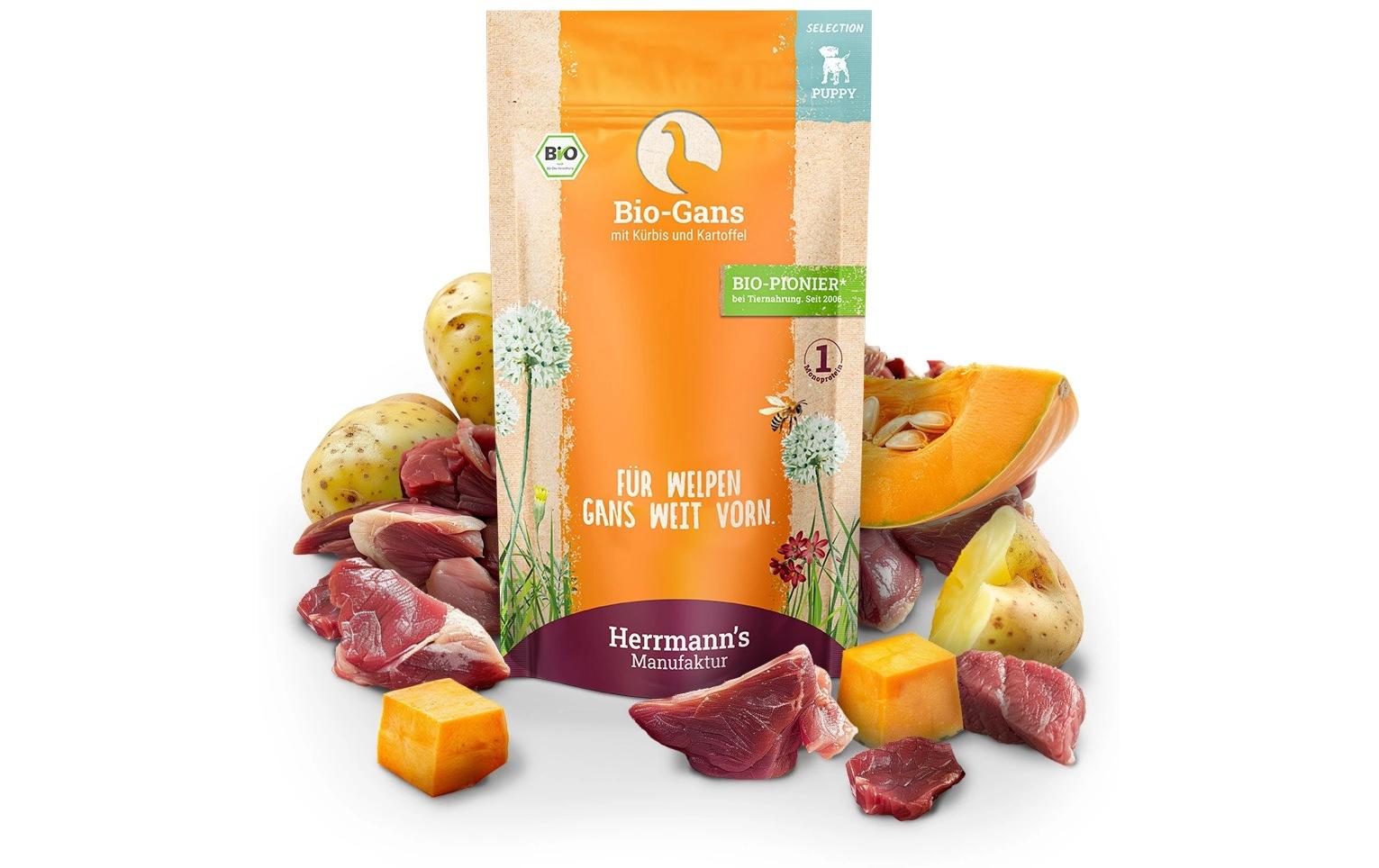 Herrmann’s Nassfutter Bio Gans mit Kürbis und Kartoffel 14 x 150 g Tierbedürfnis: Kein besonderes Bedürfnis, Nachhaltigkeit: EU BIO, Lebensphase: Junghunde, Tierart: Hund, Fleischsorte: Gans, Futtereigenschaft: Bio, Getreidefrei, Glutenfrei, Hoher Fleischanteil, Ohne künstliche Zusätze, Ohne Zuckerzusatz
