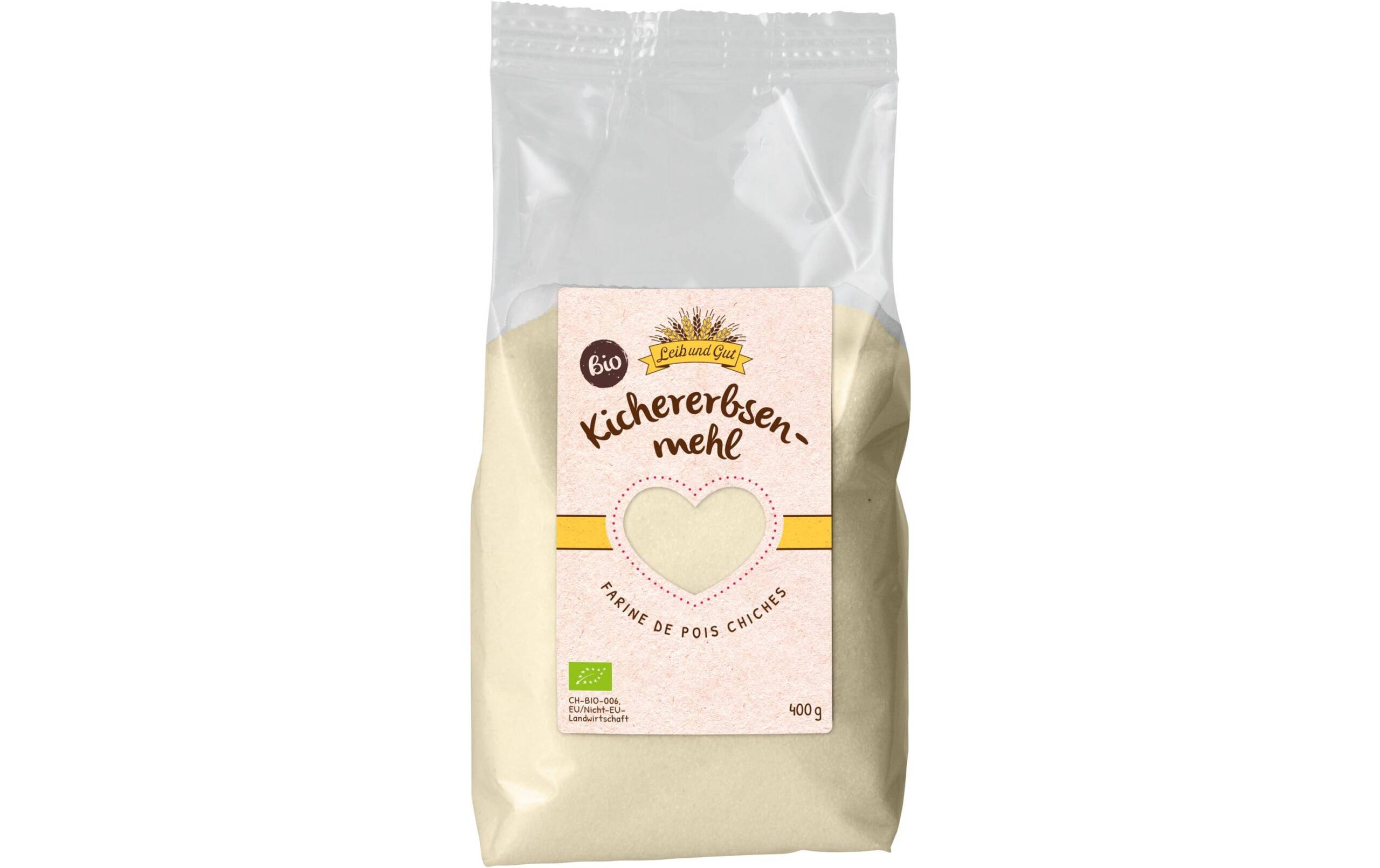 Leib und Gut Bio Kichererbsenmehl 400 g Produkttyp: Mehl, Nährwertangabe pro: 100 g, Energiegehalt (in kj): 1540 KJ, Energiegehalt (in kcal): 365 Kcal, Fett: 6.11 g, Davon gesättigte Fettsäuren: 1.03 g