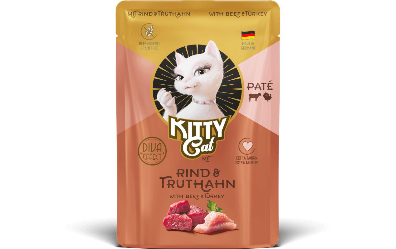 KITTY Cat Nassfutter KittyCat Paté Pouch Rind, Truthahn 85 g Tierbedürfnis: Kein besonderes Bedürfnis, Lebensphase: Adult (1-7 Jahre), Tierart: Katze, Fleischsorte: Rind, Truthahn, Futtereigenschaft: Getreidefrei, Glutenfrei, Ohne künstliche Zusätze, Ohne Zuckerzusatz, Produkttyp: Alleinfutter