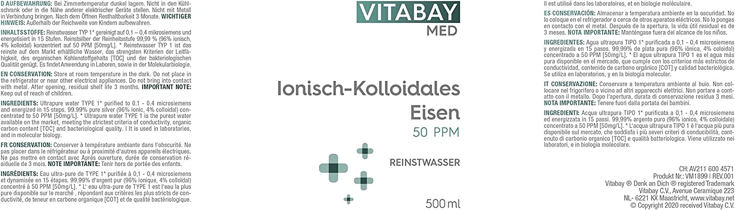 - 💎 PURE REINHEIT – Vitabay Kolloidales Eisen 50 PPM weist eine Reinheit von 99,99% auf. Ohne weitere Zusätze, wie Chloride, Proteine oder Salze. Zudem enthält es den optimalen Anteil an positiv geladenen Ionen und wird mit destilliertem Reinstwasser (Typ1 gereinigt auf 0,1-0,4 mikrosiemens und energetisiert in 15 Stufen) hergestellt.