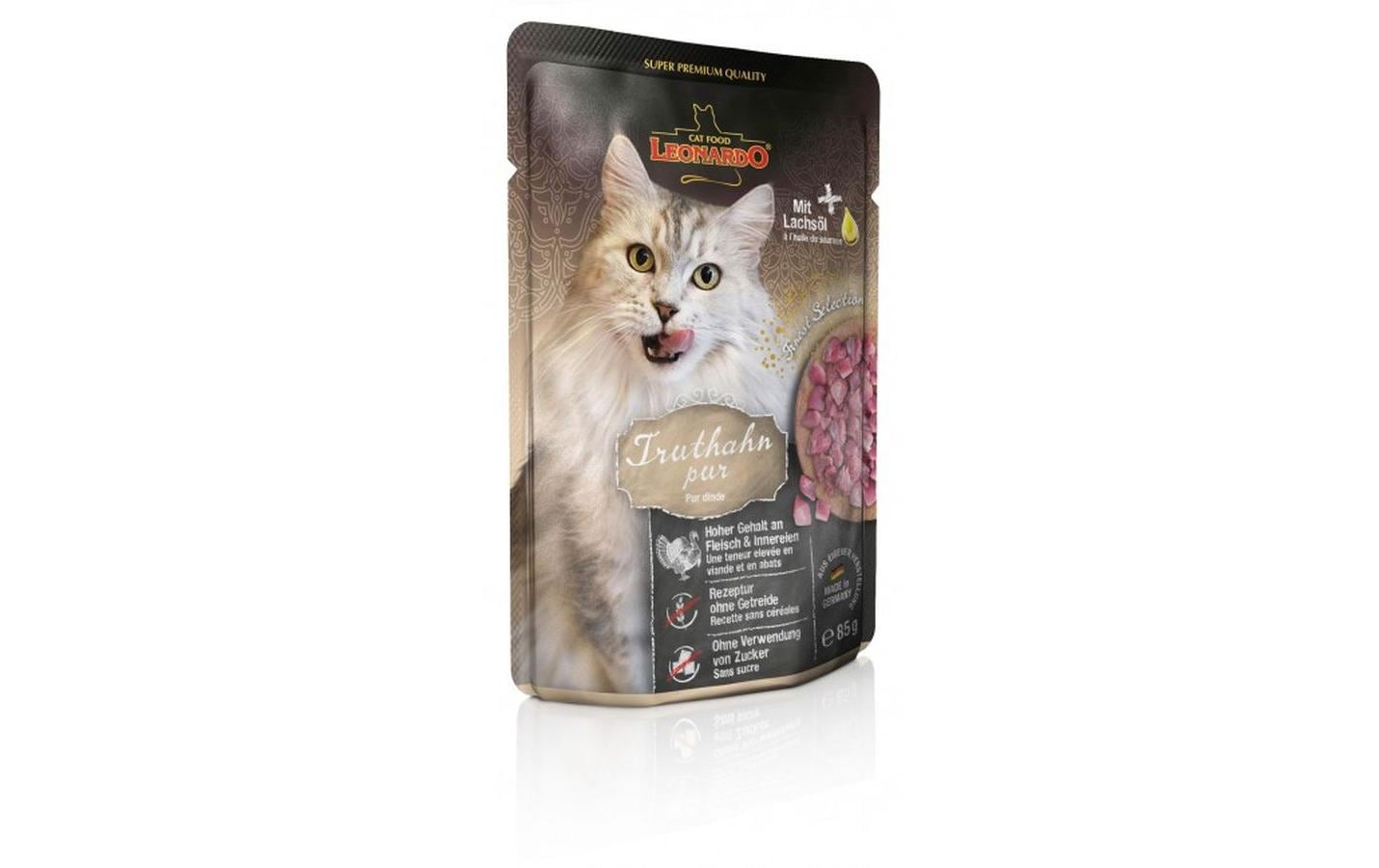 Leonardo Cat Food Nassfutter Truthahn Pur, 85 g Tierbedürfnis: Haut & Fell, Lebensphase: Adult (1-7 Jahre), Tierart: Katze, Fleischsorte: Truthahn, Futtereigenschaft: Getreidefrei, Glutenfrei, Hoher Fleischanteil, Hypoallergen, Ohne künstliche Zusätze, Ohne Zuckerzusatz, Produkttyp: Alleinfutter