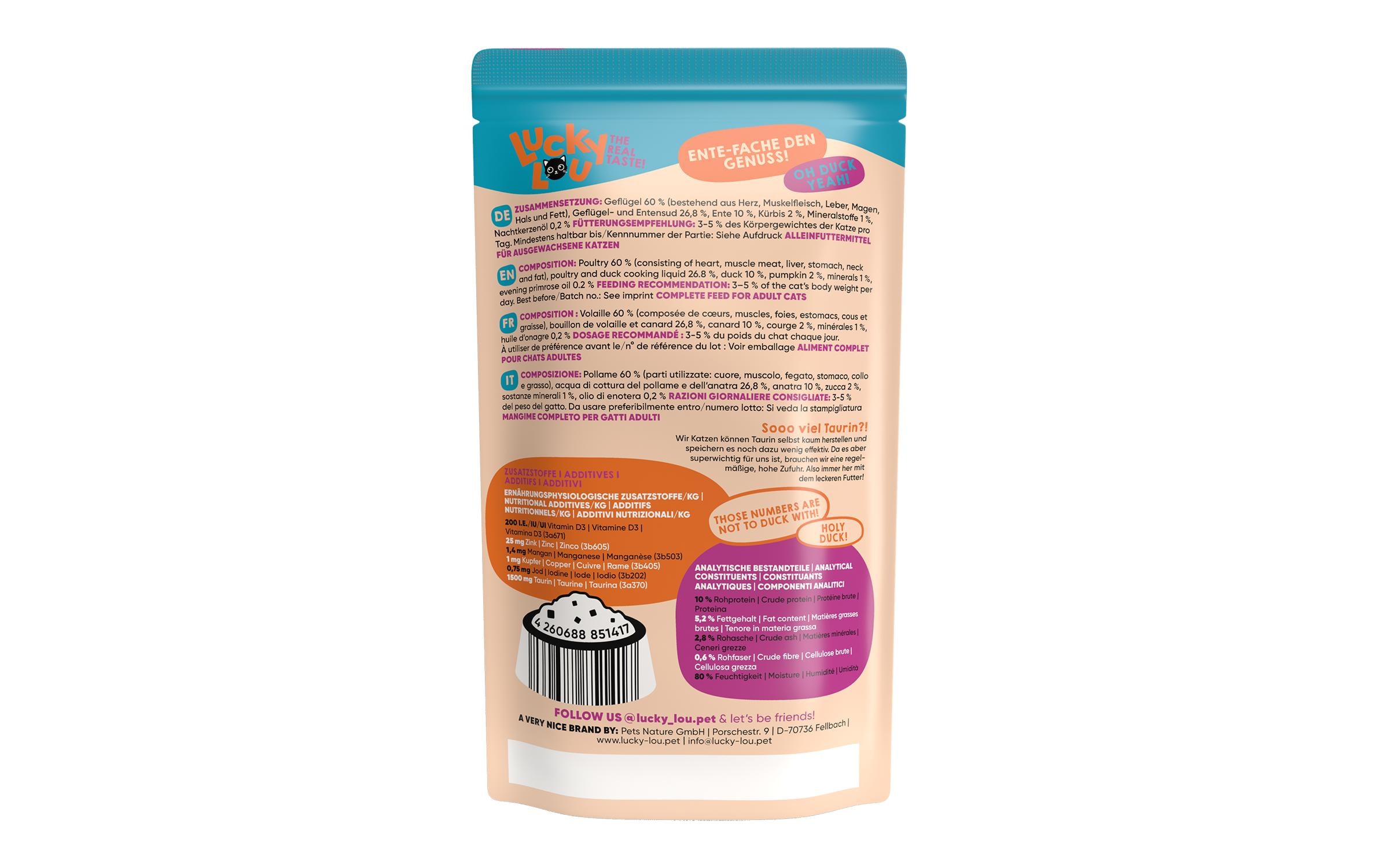 Lucky Lou Nassfutter Lifestage Adult Geflügel & Ente, 125 g Tierbedürfnis: Gewichtskontrolle, Lebensphase: Adult (1-7 Jahre), Tierart: Katze, Fleischsorte: Ente, Futtereigenschaft: Getreidefrei, Glutenfrei, Kastriert / Sterilisiert, Ohne Zuckerzusatz, Produkttyp: Alleinfutter