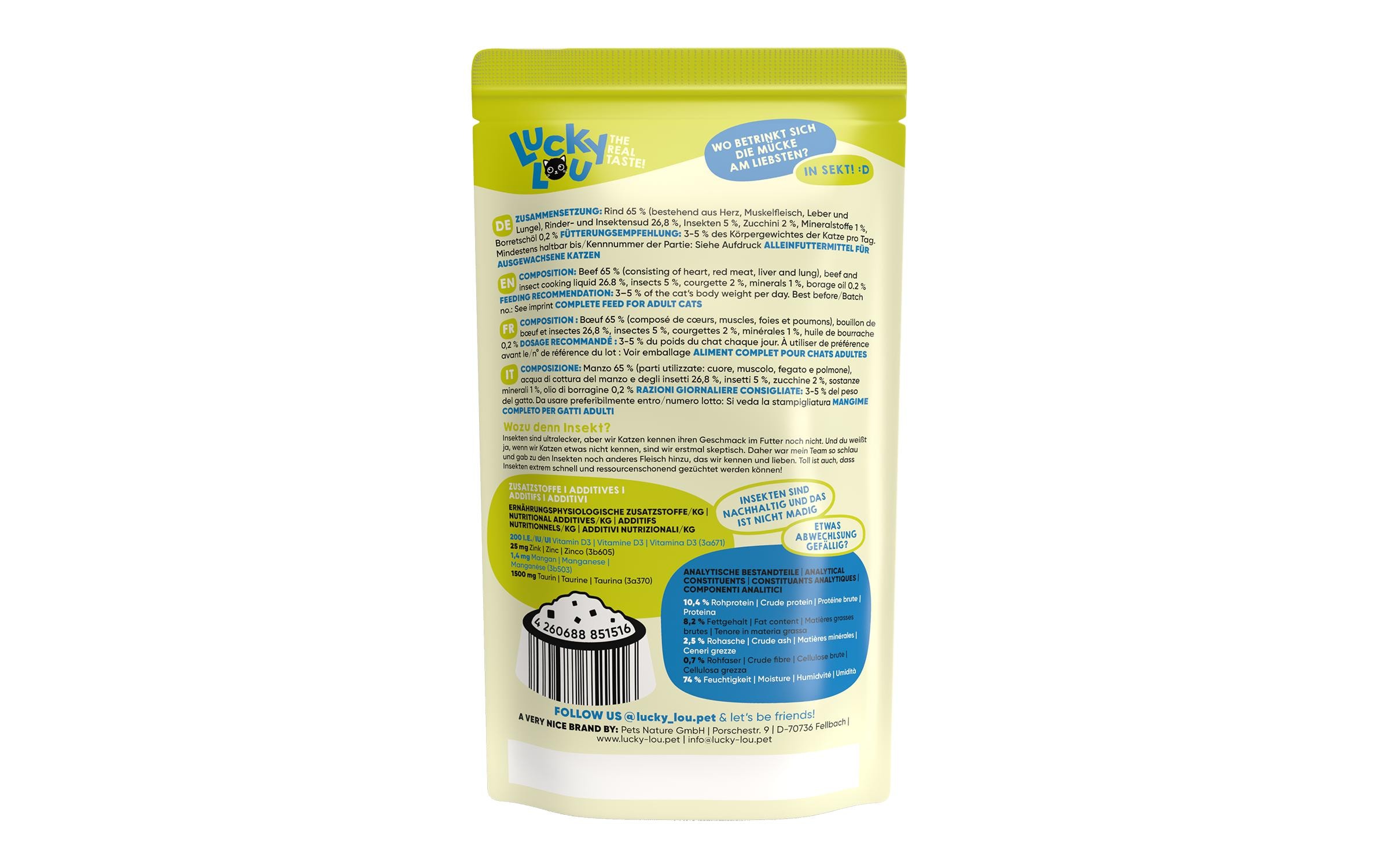 Lucky Lou Nassfutter Lifestage Adult Rind & Insekten, 16 x 125 g Tierbedürfnis: Gewichtskontrolle, Lebensphase: Adult (1-7 Jahre), Tierart: Katze, Fleischsorte: Insekten, Rind, Futtereigenschaft: Getreidefrei, Glutenfrei, Ohne Zuckerzusatz, Produkttyp: Alleinfutter