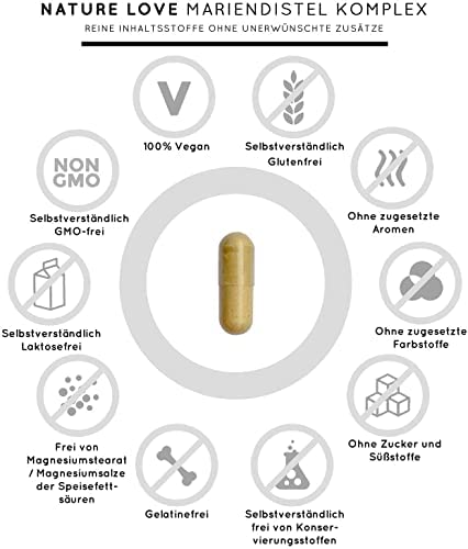 - MADE IN GERMANY, OHNE ZUSÄTZE & 100% VEGAN: Laborgeprüfter Mariendistel Komplex ohne unerwünschte Zusätze. Hergestellt in Deutschland unter strengsten Qualitätskontrollen. Frei von Trennmitteln wie Magnesiumstearat, Füllstoffen, Gelatine, Aromen, Farbstoffen, Konservierungsstoffen und selbstverständlich GMO-frei. Für Veganer und Vegetarier geeignet.