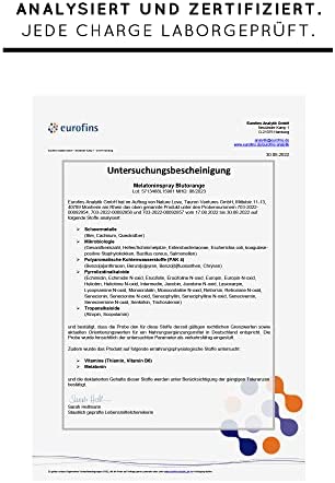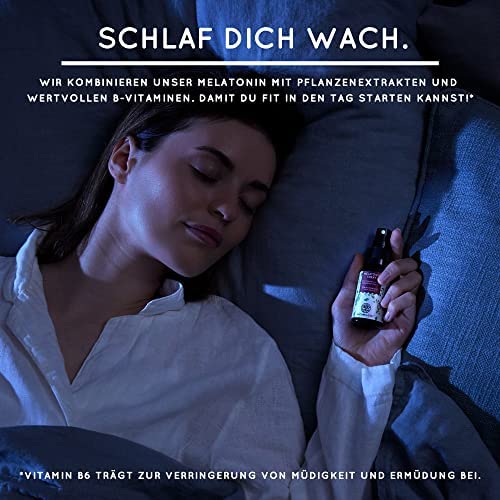 TRAUMHAFTE ZUSAMMENSETZUNG: Mit nur 2 Sprühstößen nimmst du 0,5 mg hochwertiges Melatonin zu dir. Außerdem 0,33 mg Vitamin B1, 0,42 mg Vitamin B6, 5 mg Grünteeextrakt und 10 mg Passionsblumenextrakt. Vorrat für 105 Nächte.