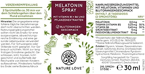 NATURE LOVE® Melatonin Spray – Blutorangengeschmack – ohne Alkohol – 0,5 mg Melatonin pro Tagesdosis – mit Vitamin B1, B6, Grüntee Extrakt und Passionsblumen Extrakt – 30 ml, vegan, hochdosiert
