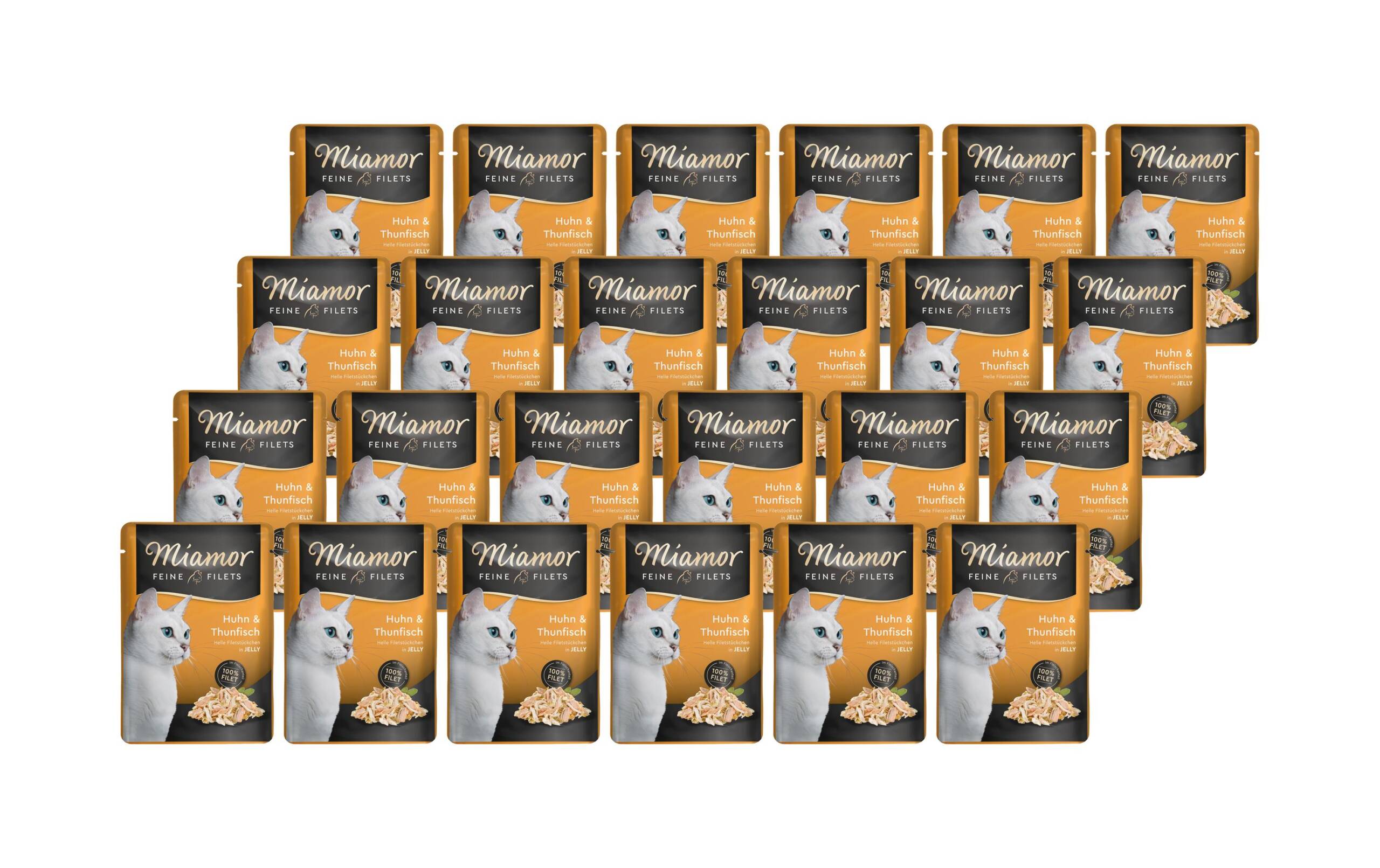 Miamor Nassfutter Feine Filets Thun & Huhn in Gelée, 24 x 100 g Tierbedürfnis: Gewichtskontrolle, Fleischsorte: Huhn, Thunfisch, Futtereigenschaft: Getreidefrei, Glutenfrei, Hoher Fleischanteil, Hypoallergen, Ohne künstliche Zusätze, Ohne Zuckerzusatz, Produkttyp: Ergänzungsfutter, Packungsgrösse: 2400 g, Lebensphase: Adult (1-7 Jahre), Senior (7 Jahre +)