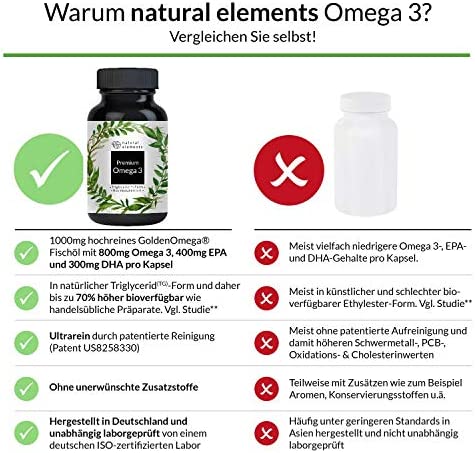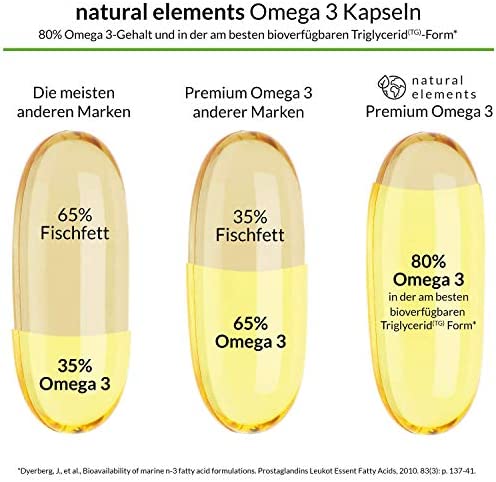 - PREMIUM OMEGA 3: Sehr hoher Omega-3 Gehalt durch molekulare Destillation und ein patentiertes Konzentrationsverfahren (Patent US8957231). Unsere 1000mg Kapseln enthalten min. 800mg Omega 3, davon min. 400mg EPA & 300mg DHA pro Kapsel. ACHTUNG: Bei den meisten Herstellern benötigen Sie ca. 3 Kapseln für die gleiche EPA/DHA-Dosis. Zusätzlich ist unser Omega 3 in natürlicher Triglycerid-Form bis zu 70% höher bioverfügbar als handelsübliche Präparate in künstlicher Ethylester-Form (Vgl. Studie**).