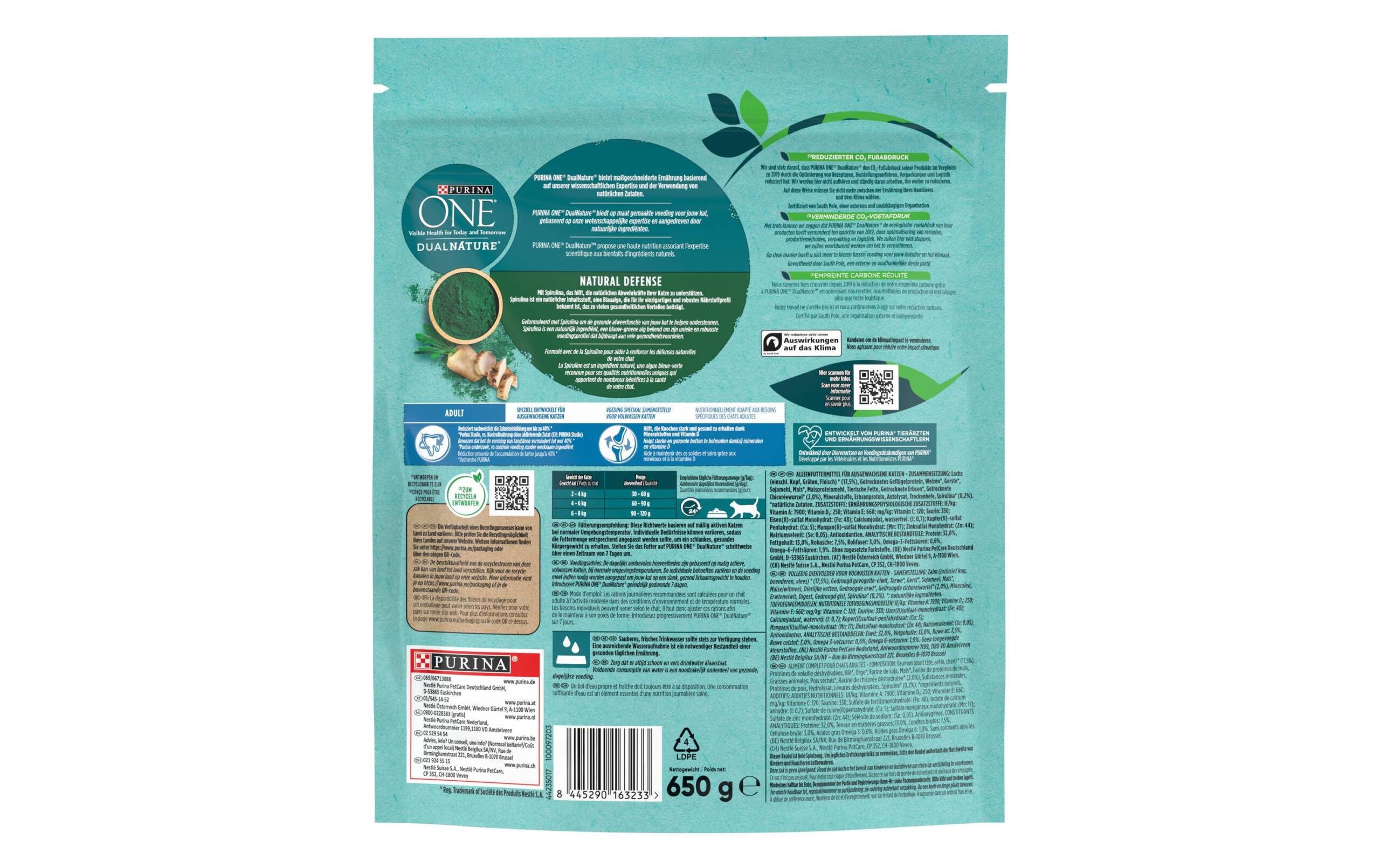 Purina ONE Trockenfutter Dual Nature Adult Lachs & Spirulina, 650 g Tierbedürfnis: Kein besonderes Bedürfnis, Fleischsorte: Lachs, Futtereigenschaft: Ohne künstliche Zusätze, Ohne Zuckerzusatz, Produkttyp: Alleinfutter, Packungsgrösse: 0.65 kg, Lebensphase: Adult (1-7 Jahre)