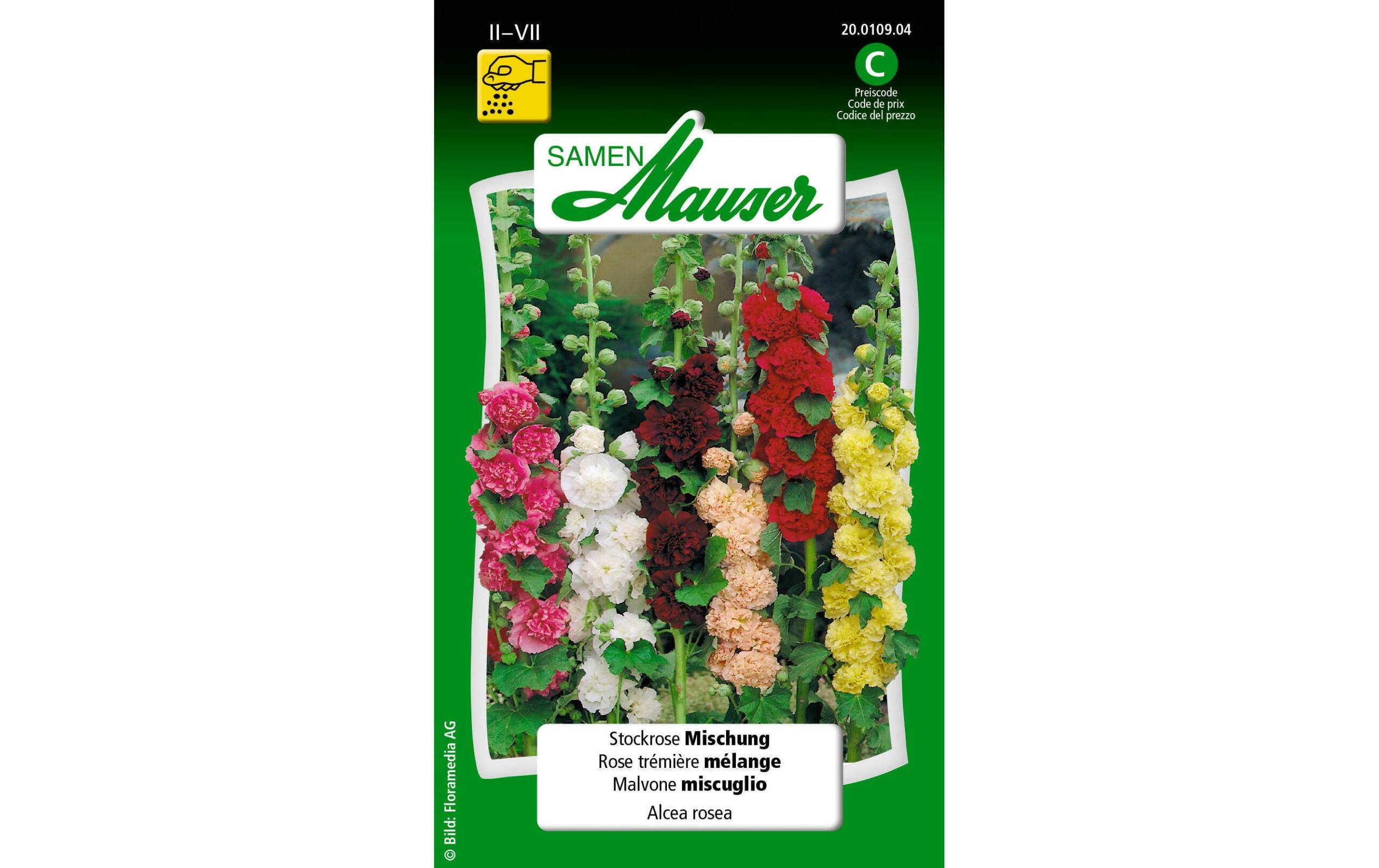 Samen Mauser Saatgut Stockrose Mischung Bio: Nein, Blütezeit: August, Juli, September, Blütenfarbe: Mehrfarbig, Sonneneinstrahlung: Sonnig, Aussaatzeit: April, Februar, Juli, Juni, Mai, März, Saattyp: Saatgut