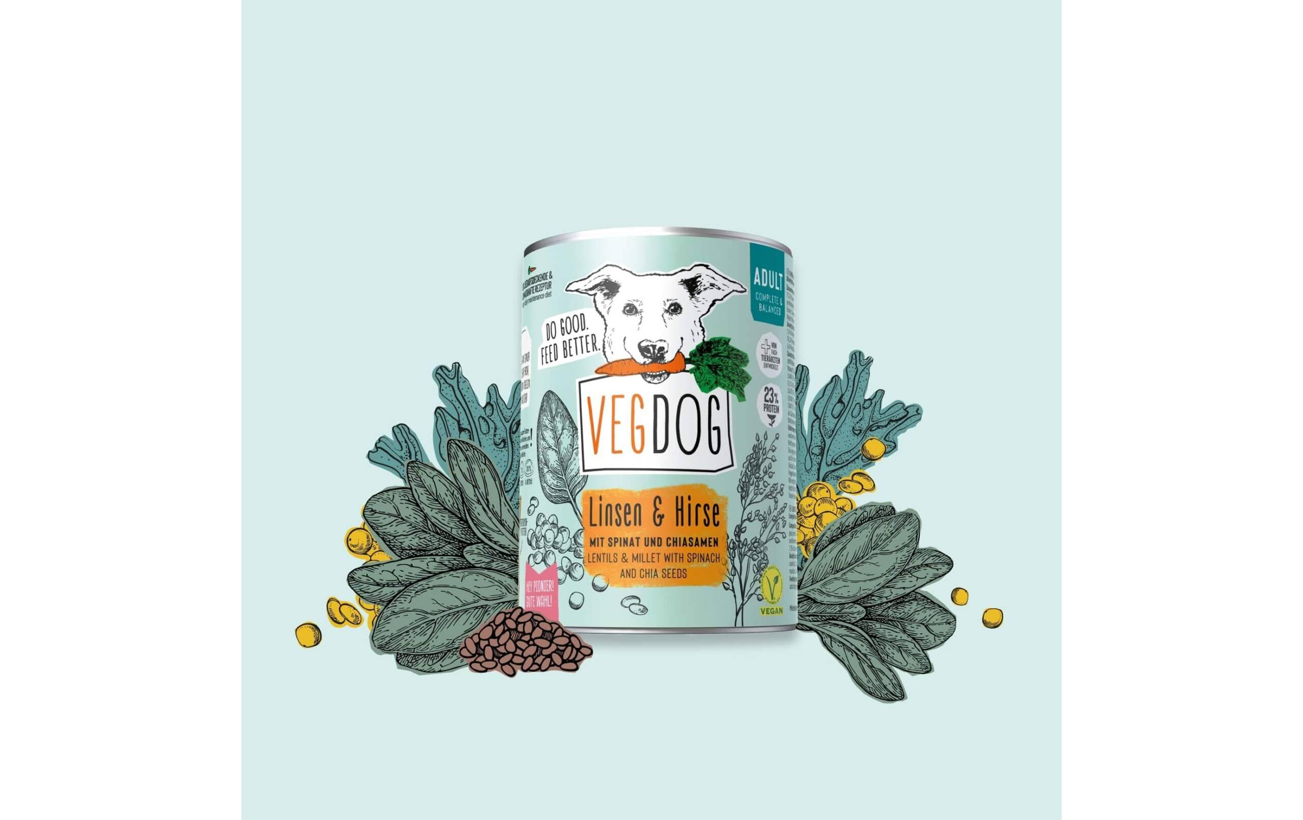 Vegdog Nassfutter Adult Linsen + Hirse, 6 x 400g Tierbedürfnis: Verdauung, Magen & Darm, Nachhaltigkeit: Nicht angegeben, Lebensphase: Adult, Tierart: Hund, Fleischsorte: Vegan, Futtereigenschaft: Glutenfrei, Hypoallergen, Ohne künstliche Zusätze