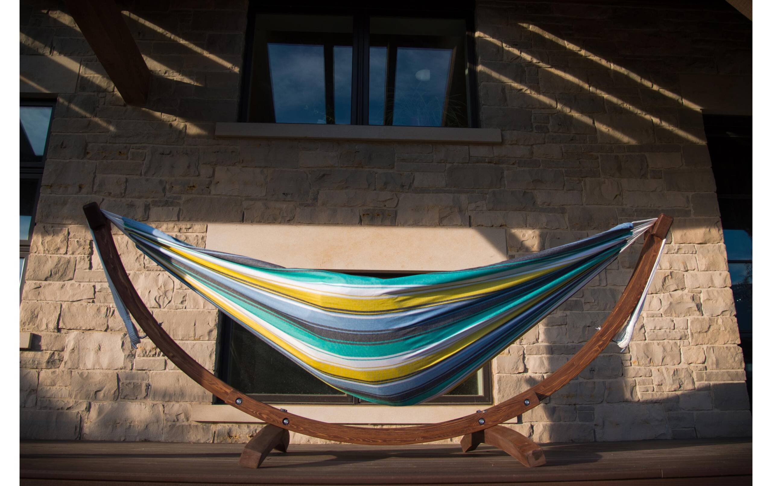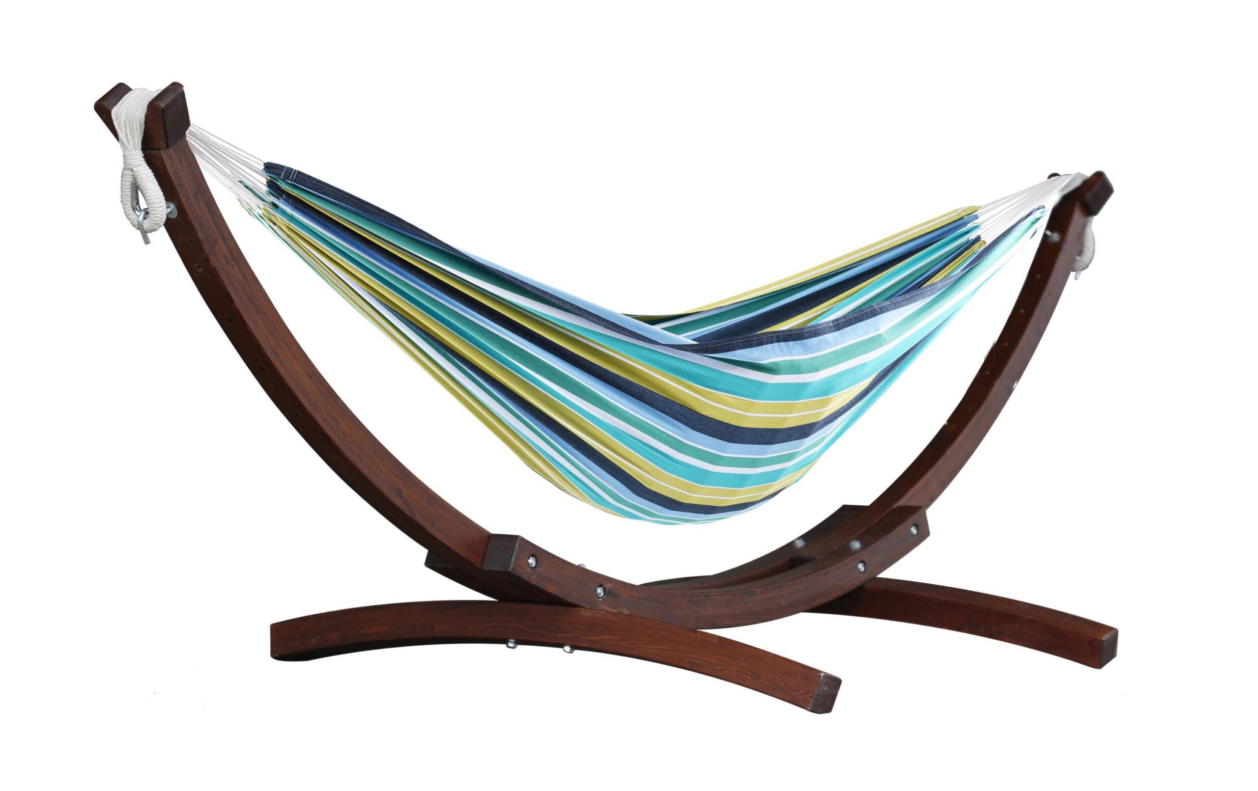 Vivere Doppelhängematte Double Cotten Cayo Reef mit Holzgestell Nachhaltigkeit: Keine Zertifizierung, Breite: 119 cm, Länge: 220 cm, Belastbarkeit: 204 kg, Farbe: Beige, Dunkelblau, Hellblau, Weiss, Anzahl Personen: 2
