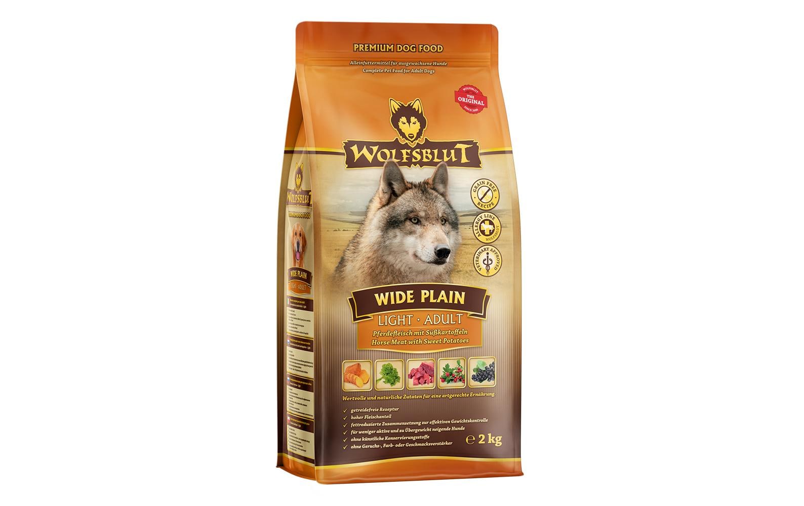 Wolfsblut Trockenfutter Dog Adult Light Wide Plain, 2 kg Tierbedürfnis: Kein besonderes Bedürfnis, Zertifikate: Keine Zertifizierung, Fleischsorte: Pferd, Futtereigenschaft: Glutenfrei, Produkttyp: Alleinfutter, Packungsgrösse: 2 kg